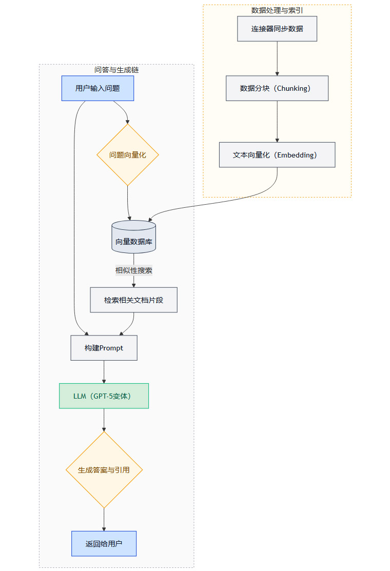 “公司知识”功能的背后,是一套精密的、专为企业场景设计的技术架构。它巧妙地结合了数据连接、检索增强生成(RAG)以及先进的大语言模型,同时将企业级的安全与权限控制贯穿始终。