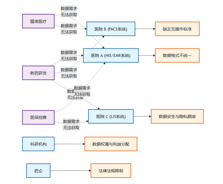 管理壁垒。数据被视为医院的核心资产,出于竞争、安全等多重考虑,医院缺乏共享数据的动力。跨机构的数据共享流程复杂,审批困难重重。