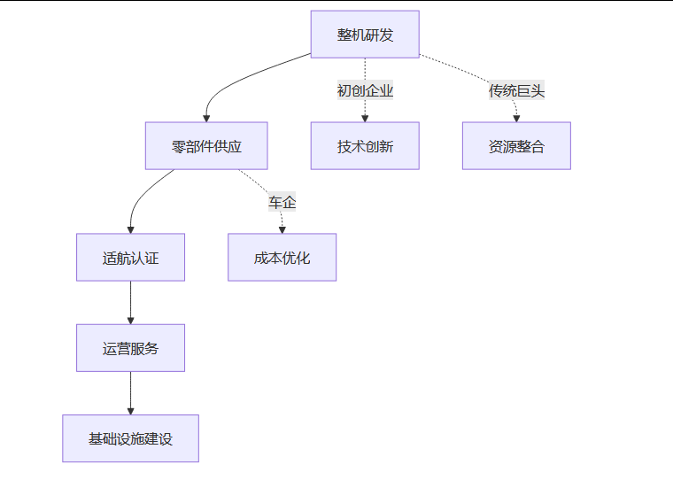 eVTOL的发展,离不开产业链的协同。下面这个简单的流程图,展示了产业链的主要环节和不同类型参与者的关键作用。