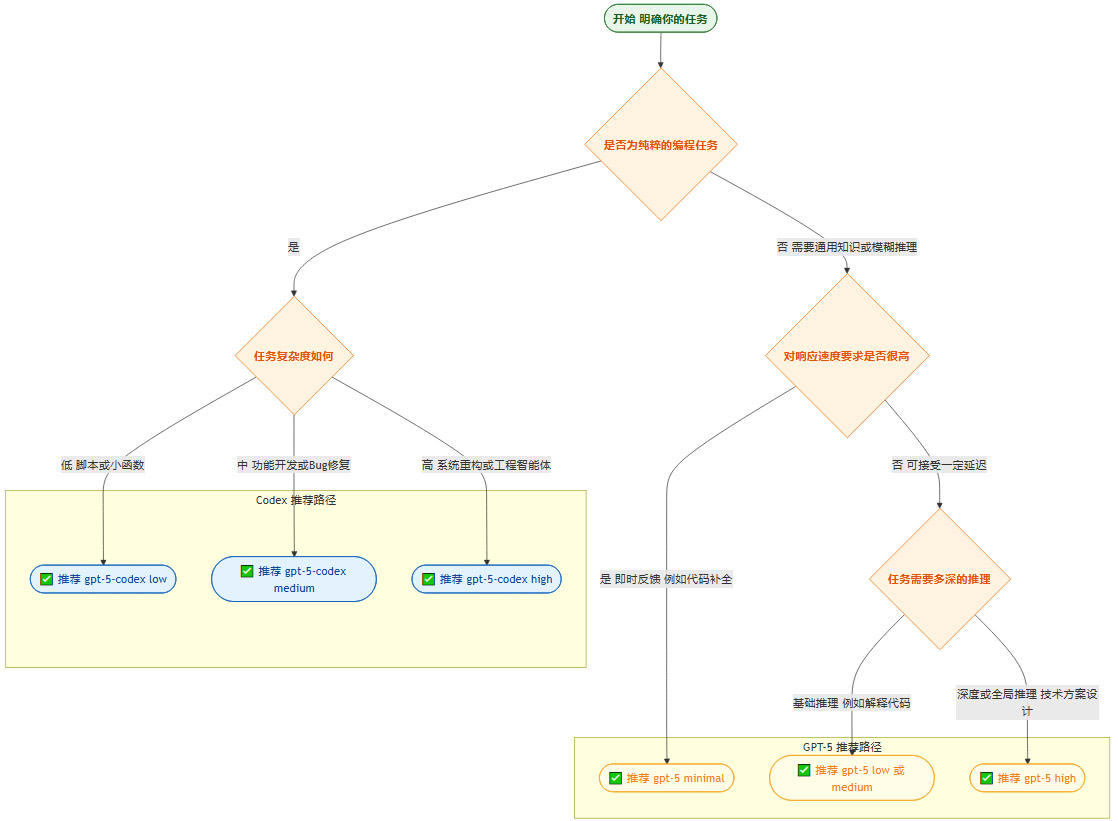 首选模型:gpt-5-codex (medium)。这是主力模型,它在代码理解、生成和修复能力之间取得了最佳平衡,足以应对绝大多数日常开发任务。