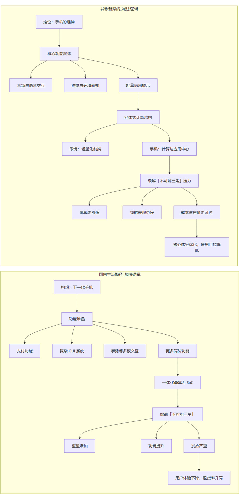 在“不可能三角”的约束下,如何进行产品定义和市场切入,成为了摆在所有玩家面前的核心战略问题。观察当前市场,可以清晰地看到两种截然不同的解题思路,一种是以国内众多厂商为代表的“加法”模式,另一种则是以谷歌新路线图为代表的“减法”哲学。