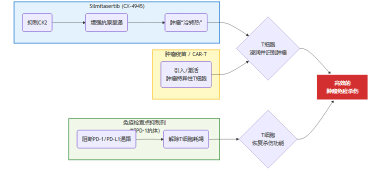 这个示意图清晰地展示了Silmitasertib如何作为核心枢纽,为多种先进的免疫疗法赋能。