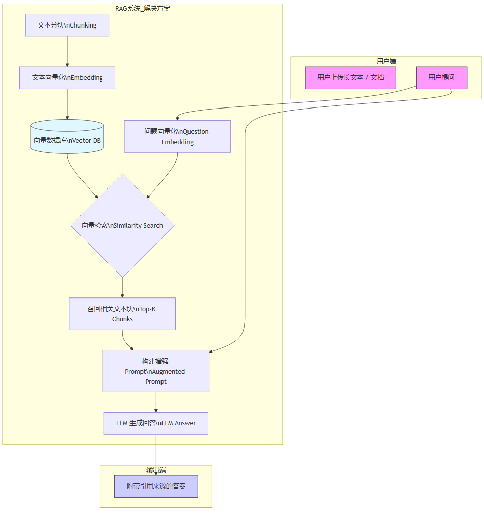 上图展示的**检索增强生成(RAG)**是当前应对该问题的标准架构。其核心思想是,将长文本预处理后存入外部知识库(如向量数据库),在回答问题时,先根据问题检索出最相关的文本片段,再将这些片段连同问题一起提交给模型。这相当于为模型准备了一份“开卷考试”的“小抄”,极大地降低了其记忆负担和幻觉概率。