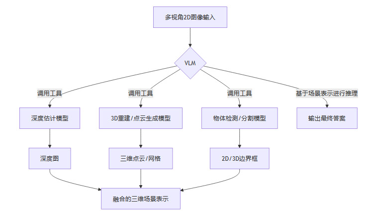 这种范式将VLM视为一个高级控制器或语义理解中心,为其配备一系列专门处理三维信息的外部工具。其工作流程通常如下: