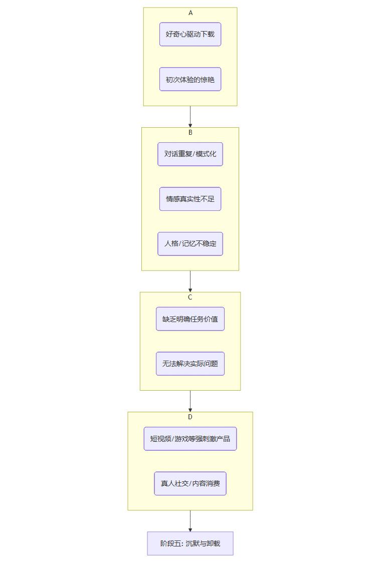 这个路径的核心在于,当最初的新鲜感消退后,产品未能提供持续、不可替代的核心价值,导致用户在遇到互动瓶颈时,会毫不犹豫地转向那些能提供更强即时反馈和满足感的替代品。
