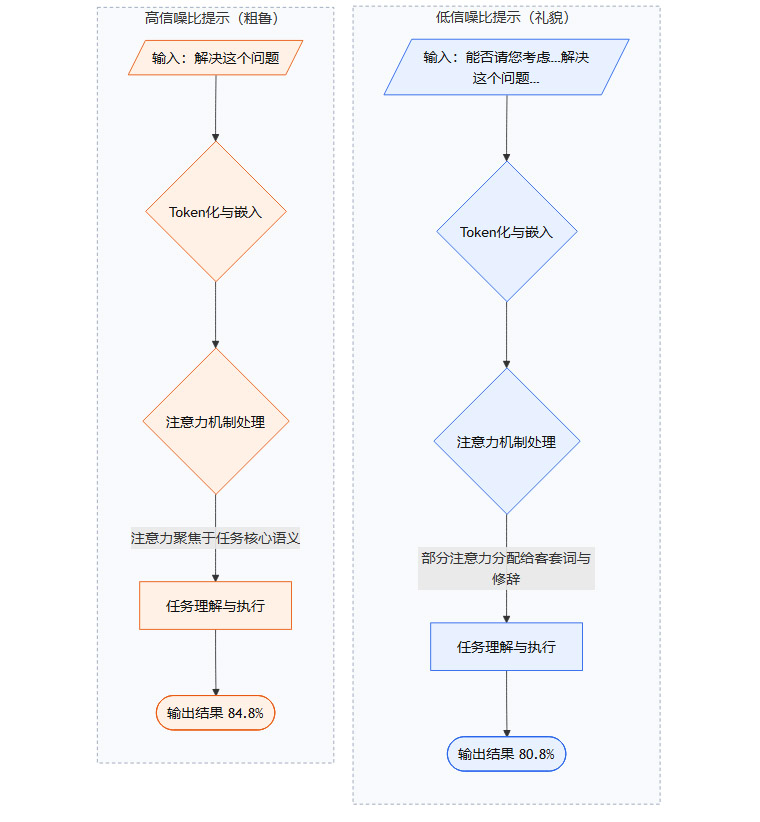 高噪声提示(低信噪比):“非常有礼貌”的提示充满了社交礼仪相关的Token。这些Token虽然符合人类沟通习惯,但对于一个纯粹的计算任务而言,它们构成了语义噪声。模型需要消耗一部分计算资源来处理这些噪声,从而可能影响其对核心“信号”的聚焦。