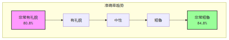 中间梯度:其他三个语气组别(有礼貌、中性、粗鲁)的准确率则稳步地分布在这两个极值之间,形成了一条清晰的上升直线。