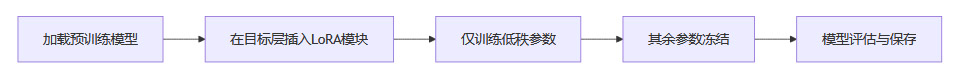 LoRA的核心思想是在模型关键层(如Transformer的注意力层)插入两个低秩矩阵A和B,仅训练这部分新增参数(通常占总参数0.1%~1%),其余原始权重保持冻结。前向传播时,模型输出为原权重加上A·B的低秩调整项,从而实现对模型能力的高效微调。