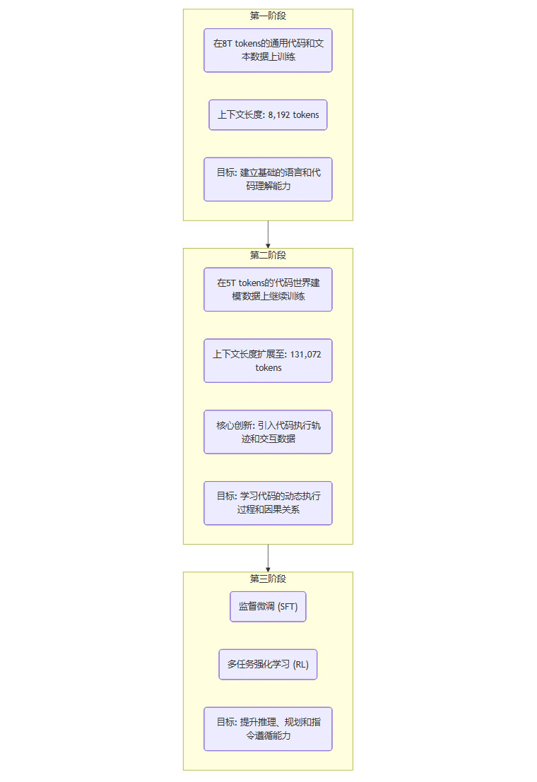 CWM之所以能够理解代码执行,其秘诀在于它独特且精细的三阶段训练流程。这个流程系统性地将“世界建模”能力注入到模型中。