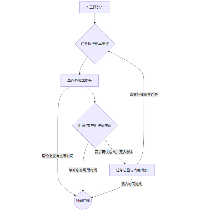 执行成本的下降并未带来预期的闲暇。相反,它触发了一个自我强化的循环,导致工作总量和认知负荷不降反增。这背后是经济学、心理学和组织行为学共同作用的结果。