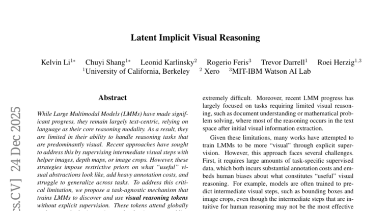 为了打破这一僵局,来自加州伯克利大学、Xero公司及MIT-IBM Watson AI Lab的研究团队(包括Kelvin Li、Chuyi Shang等人)提出了一种名为潜在隐式视觉推理(Latent Implicit Visual Reasoning, LIVR)的全新方法,其研究成果已发布于arXiv预印本平台(论文编号:arXiv:2512.21218v1)。LIVR的核心思想极具颠覆性,它不再试图优化“翻译”过程,而是通过巧妙的结构设计,引导模型在内部开辟一个专用的“视觉工作台”,学会直接用视觉表征进行思考和推理。本文将深入剖析LIVR的设计哲学、核心机制、实验表现及其对多模态技术未来走向的深远影响。