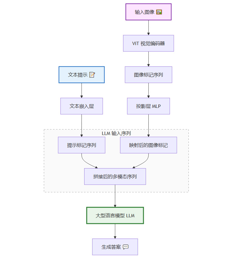 这个架构的本质,是将视觉问题强行转化为一个语言问题。图像标记在进入LLM后,其身份就从视觉特征转变成了需要被语言模型理解和解释的“特殊词汇”。整个推理过程,实际上是LLM在学习如何用语言逻辑去组织和解读这些“伪文本”信息。