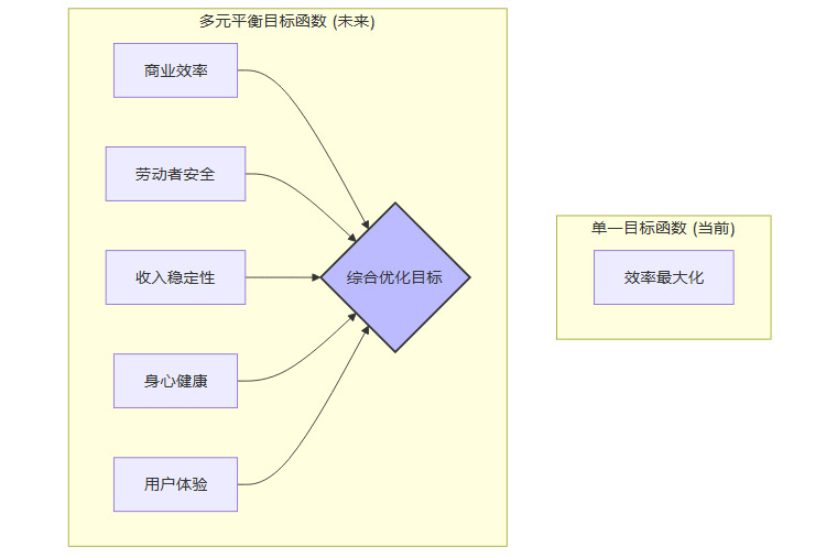 当前算法的目标函数过于单一,往往只追求商业效率(如GMV、订单密度)。未来的算法设计应转向一个更加平衡和多元的目标函数。