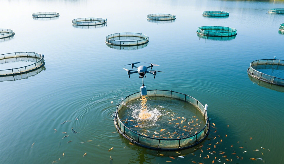 在水产养殖区,无人机可以搭载投饵机,按照预设的时间和航线,对网箱进行定时、定量、定点的精准投喂,不仅节省了人力,还优化了饲料利用率,降低了水体污染。生态修复