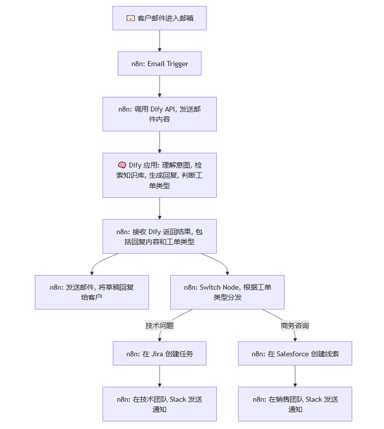 执行:n8n接收到Dify的返回结果后,兵分两路。一路将Dify生成的回复内容通过邮件节点发送给客户;另一路通过一个Switch(切换)节点,判断工单类型是“技术问题”,于是自动在Jira中创建一个技术支持工单,并将工单链接和摘要信息发送到技术团队的Slack频道。