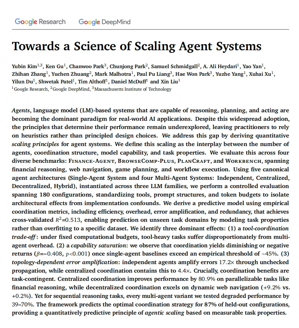 近期以Google DeepMind为代表的一系列系统性研究,通过大量对照实验,为这股热潮注入了一剂清醒剂。研究结果清晰地指出,“更多Agent等于更强性能”这一假设,在绝大多数场景下并不成立。盲目增加Agent数量,非但不能保证效果提升,反而极有可能导致系统陷入成本激增、效率暴跌、性能下降的困境。