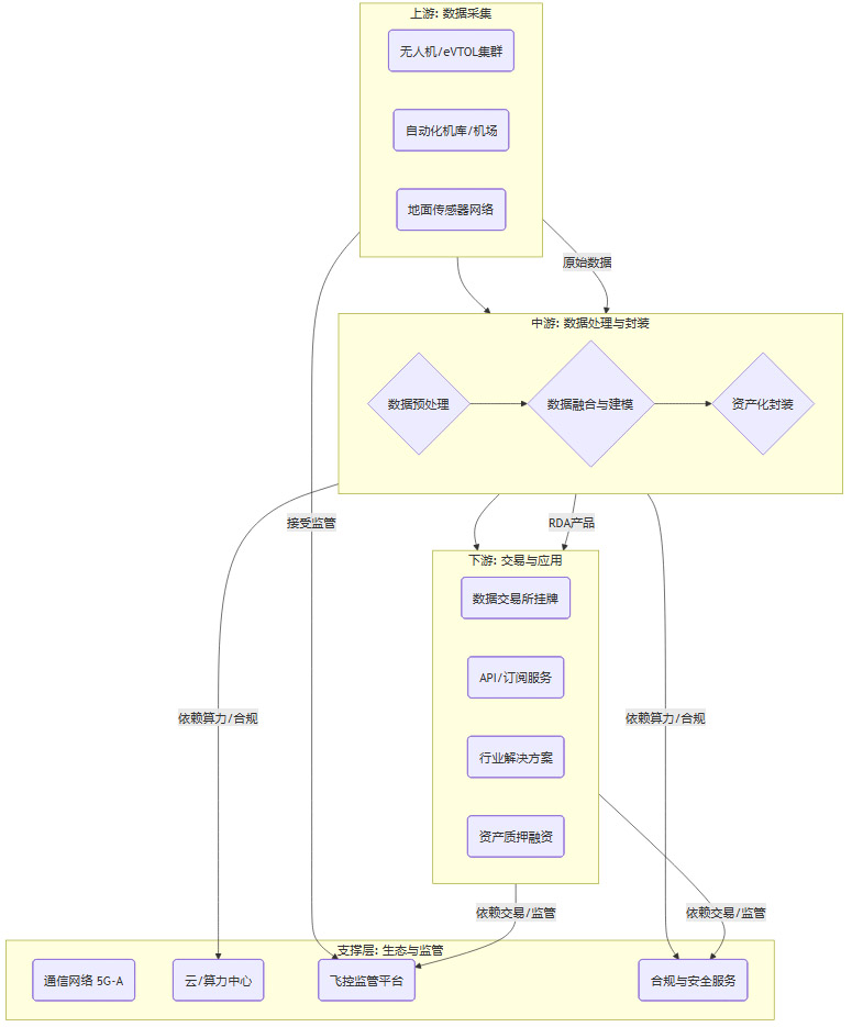 这是RDA价值链的源头。运营商通过无人机、eVTOL、地面传感器等多模态设备,采集高精度的地理信息(二维影像、三维模型)、环境监测数据(空气质量、噪声)、交通流量数据(车流、人流)以及飞行器自身的作业日志。