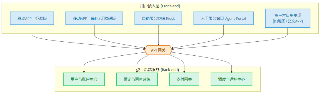 一个真正包容的服务系统,其核心理念是“后端统一、前端多样”。即,底层的预定、支付、调度和用户管理系统是统一的,但面向用户的服务接入层(Access Layer)必须是多渠道、多形态的。