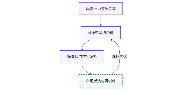 以《刺客信条:链纪元》为例,AI动态资产定价系统通过神经网络模型,实时分析全服玩家的行为数据、市场供需、装备稀有度、战斗表现等多维度信息,实现毫秒级的装备价值重估。其核心流程如下:
