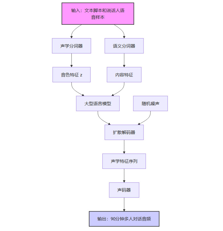 其输入格式的设计也颇具匠心,采用一种**“角色标识-语音特征-文本脚本”交错拼接**的方式。这种格式让模型能够清晰地理解每个角色的音色是什么,以及他们分别要说什么话。在生成过程中,模型可以无缝地在不同角色之间切换,保持每个角色音色的高度一致性,使得整个对话听起来自然流畅,毫无割裂感。