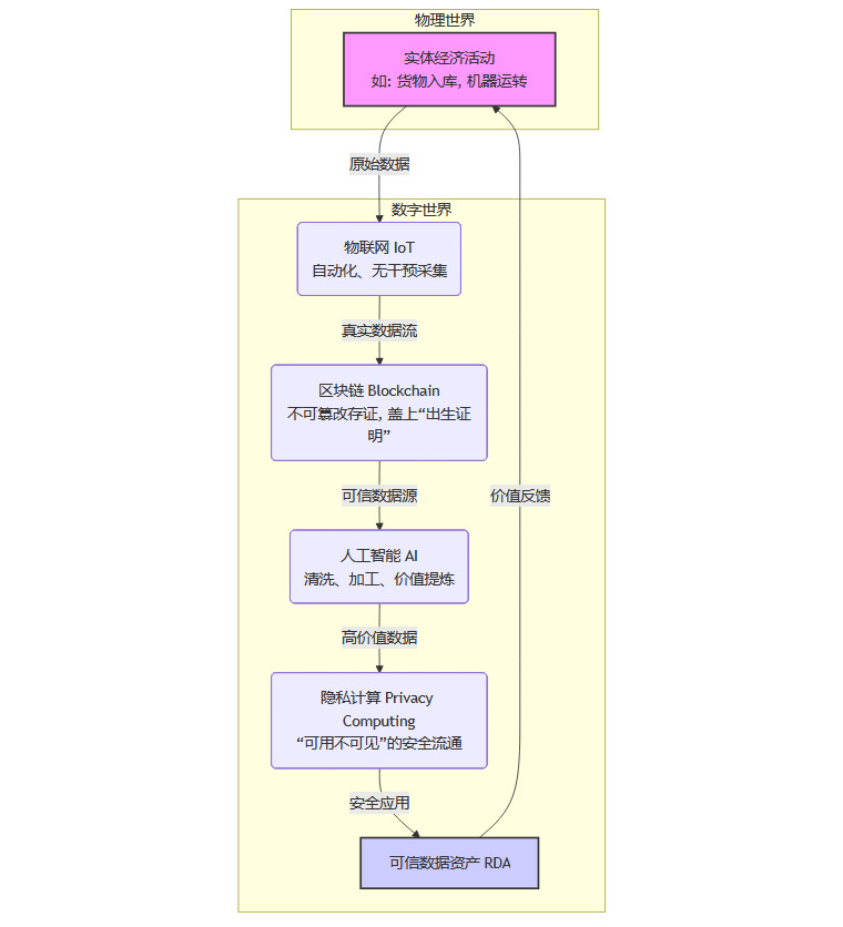 【摘要】告别虚假冗余的“垃圾数据”,真实数据资产(RDA)模式通过“实数融合”,将数据与实体经济活动强绑定。依托物联网、区块链、AI和隐私计算四大技术支柱,从源头构建信任体系,推动数据向可信、可用、可流通的资本形态跃迁,为数字经济高质量发展提供坚实基础。