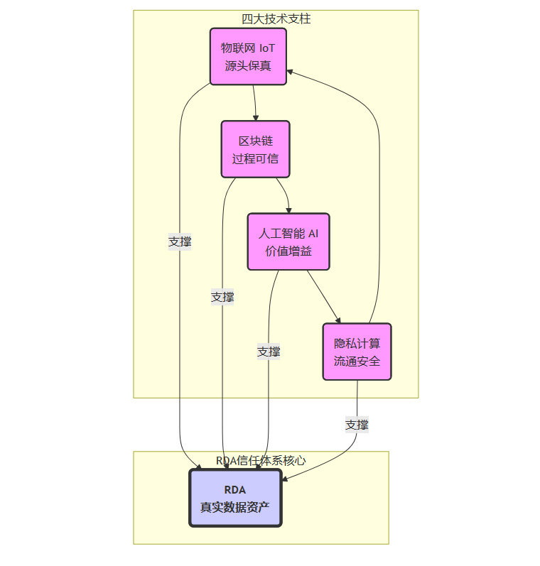 RDA的“实数融合”理念并非空中楼阁,它的实现依赖于一个由物联网、区块链、人工智能和隐私计算四大前沿技术构成的、高度协同的信任体系。这四大支柱各司其职,环环相扣,共同构建了从数据产生到价值实现的全生命周期信任保障。