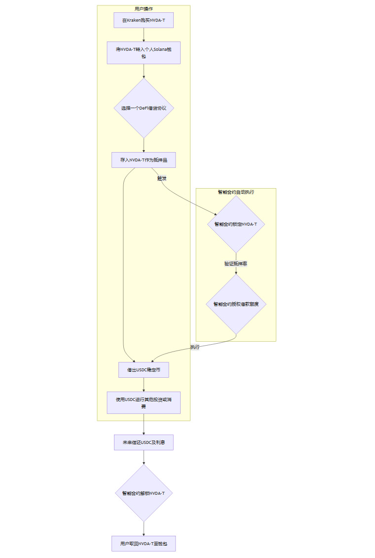 DeFi方式 Alice可以直接将她的NVDA-T存入一个去中心化的借贷协议(如Aave、Compound的链上版本)。协议会根据预设的抵押率(例如70%),允许她立即借出价值7万美元的稳定币(如USDC)。整个过程由智能合约自动执行,无需许可,几分钟内即可完成。