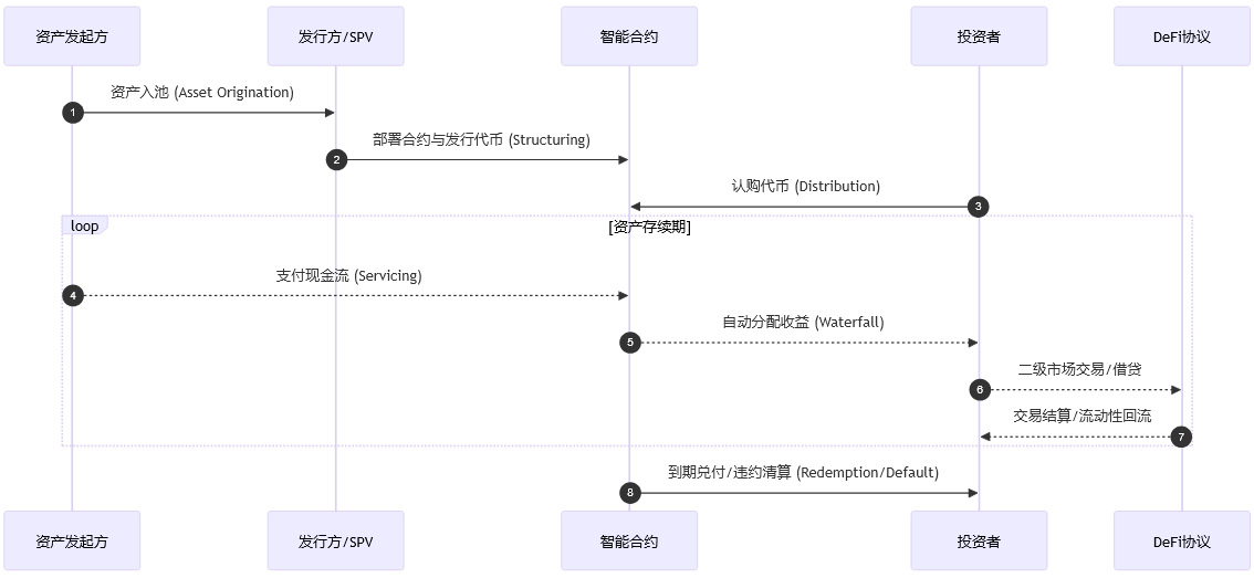 RWA结构化产品的生命周期,从链下资产的汇集到链上代币的清算,构成了一个完整的闭环。其典型的技术与业务流程可以通过下图清晰展示。