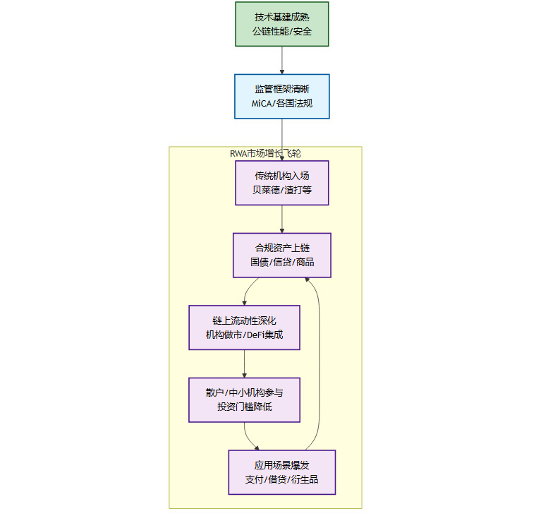 这个路径图揭示了,RWA的爆发不会一蹴而就,它需要技术、监管、机构和市场需求等多方力量的协同。当合规的资产在链上获得了比链下更好的流动性和可组合性时,市场的增长飞轮才能真正转动起来。