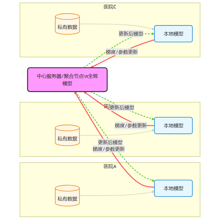 上图展示了横向联邦学习的基本原理。各家医院的数据不出本地,仅在本地训练模型并上传加密后的模型参数(或梯度)。中心服务器聚合这些参数以更新全局模型,再将更新后的模型下发。整个过程实现了联合建模,而原始数据始终保留在机构内部,保障了数据安全。