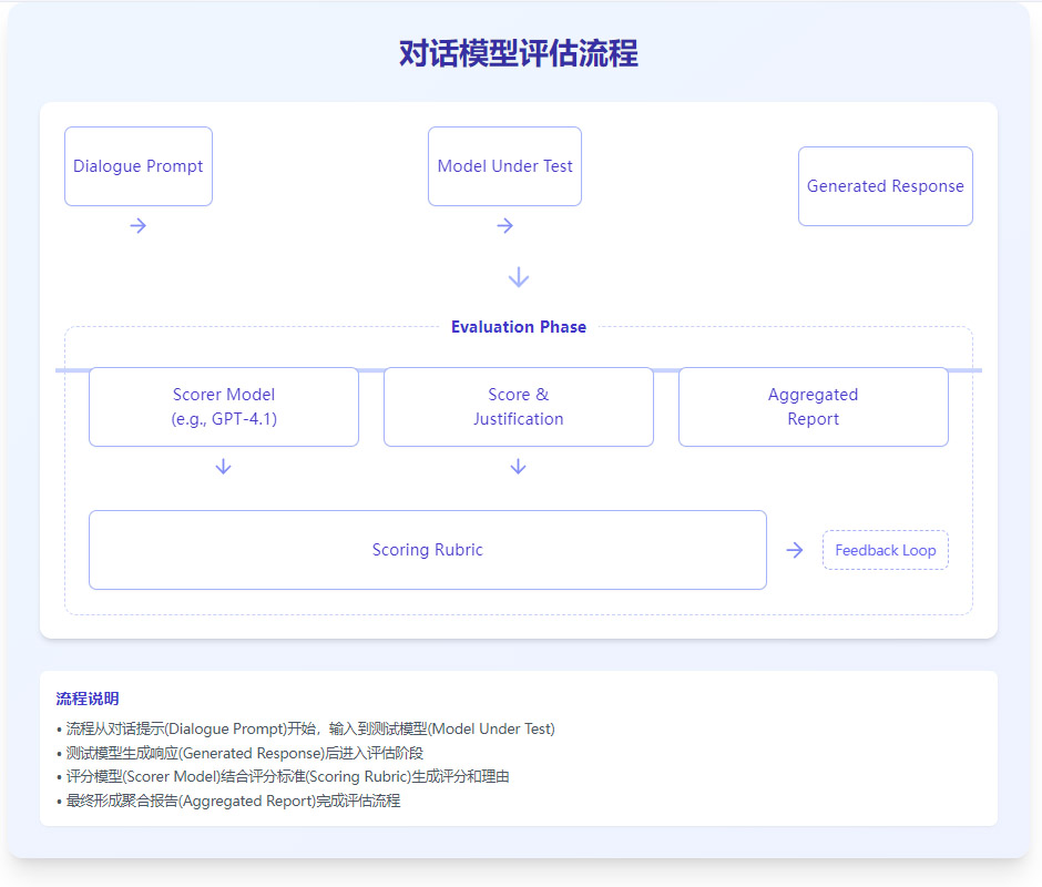 自动化评分:调用评分器API(如GPT-4.1),将生成的对话和对应的Rubric传入,获取逐条的打分和评分理由。
