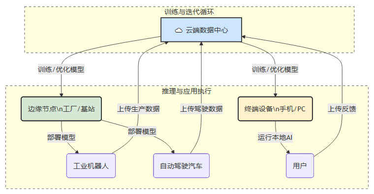 “云—边—端”协同架构并非简单的算力叠加,而是一种有机协同。例如,模型的训练和优化在云端完成,然后部署到边缘和终端进行推理。边缘和终端设备在运行中产生的数据,又可以回传到云端,用于模型的持续迭代。