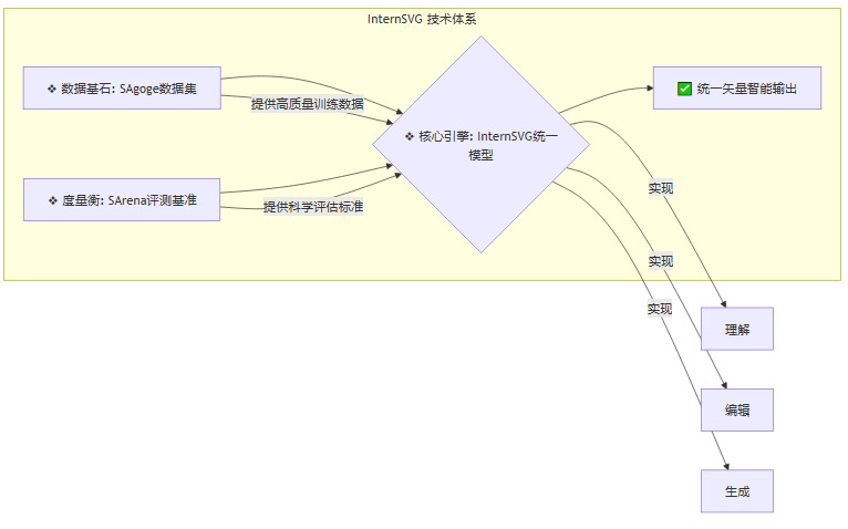InternSVG的设计思想,是从根本上解决上述问题。它没有选择单点突破,而是构建了一个相互支撑的完整生态。