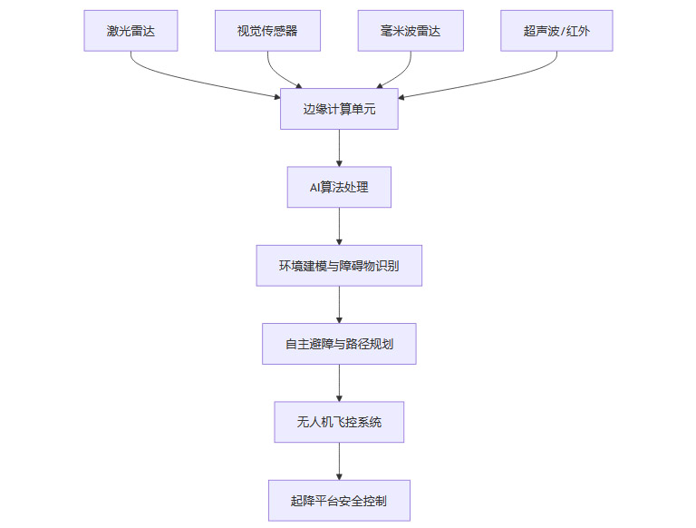 系统通过深度学习与自适应算法,能够针对环境的动态变化自动调整避障策略。AI模型在边缘计算单元本地运行,实时分析环境变化,动态优化障碍物识别与路径规划参数,实现障碍物提前预警和自主路径调整。即使在高风险场景下,系统也能保持高实时性与可靠性,极大降低起降风险和人为干预需求。