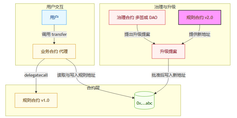当监管规则需要更新时,治理方(可以是一个多签钱包或一个去中心化自治组织DAO)可以部署一个新的规则合约(v2.0),然后通过一个特权函数,更新业务合约中存储的地址。