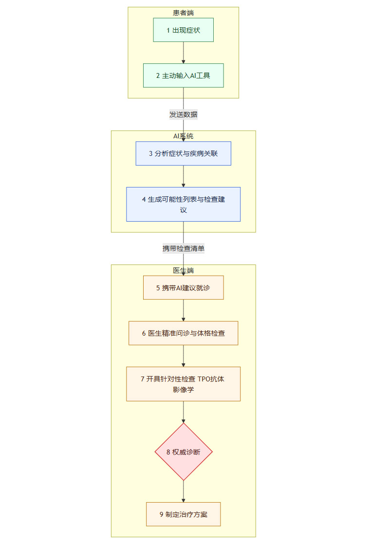 提出验证路径 为了验证这个高概率假设,AI给出了最直接、成本效益最高的验证方法——建议进行TPO抗体检测。这是一个非常精准的建议,远比进行全身CT等昂贵且有辐射的“大撒网”式检查要高明。