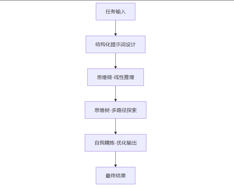 这个流程图清晰地描绘了从任务输入到最终结果的整个过程,其中结构化提示词作为起点,CoT、ToT和Self-Refine则在不同阶段发挥关键作用。