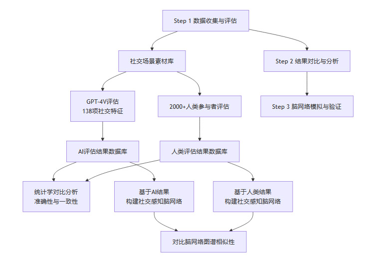 他们的做法是,分别利用AI和人类参与者对社交情境的评估结果,作为输入变量,去模拟和预测大脑在观看这些社交场景时应该如何被激活。简单来说,他们试图构建两套“大脑社交感知网络图谱”,一套基于人类的判断数据,另一套则完全基于AI的判断数据。