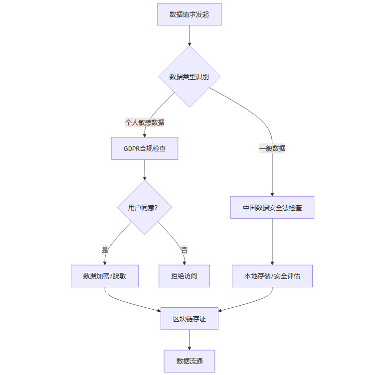 融合隐私计算、区块链与智能合约,福建实现了GDPR(欧盟通用数据保护条例)与中国《数据安全法》双合规的自动执行。智能合约可根据数据类型、流向和用户身份,自动匹配不同法律要求(如GDPR的用户明示同意、数据泄露72小时通知机制,中国的本地存储和安全评估),并自动触发加密、脱敏、审计等操作,极大降低了人工干预风险,提升了合规效率和透明度。