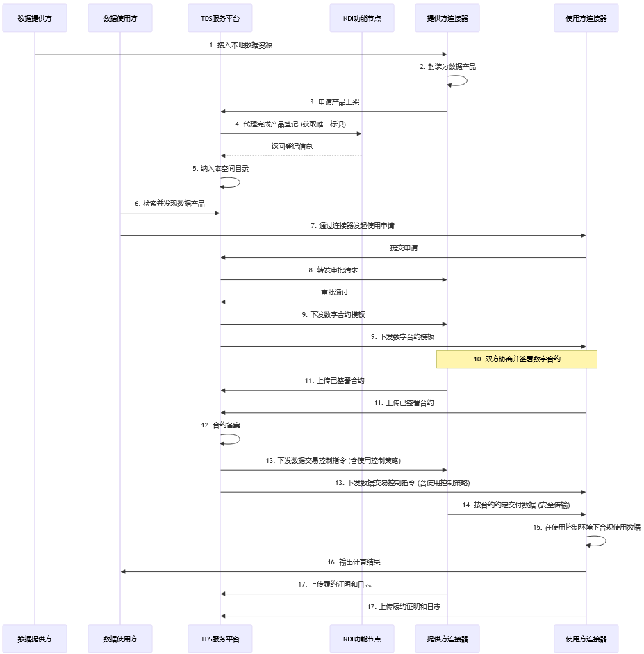 服务平台 ↔ 连接器:这是TDS内部最核心的交互,包括身份认证、产品上架、数字合约下发、使用控制策略同步、合规日志上报等。