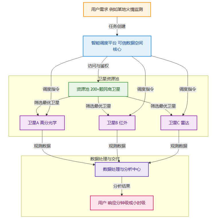 “滴滴打星”模式则完全不同。它通过可信数据空间,将超过200颗民用和商用卫星的观测能力进行智能化、服务化的封装和调度。