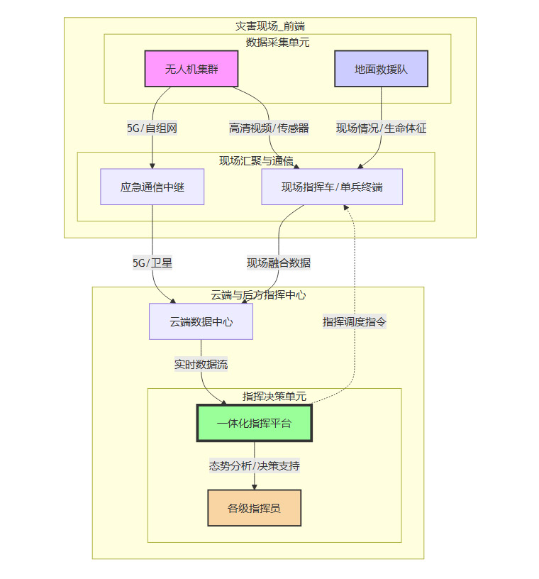 构建一个基于5G、自组网技术和卫星通信的“空-地-云”一体化指挥平台是解决信息孤岛问题的关键。