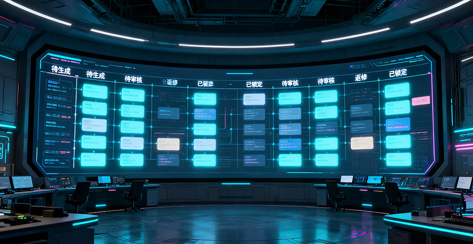 典型状态:待生成 -> 生成中 -> 待审核 -> 返修 -> 已锁定 -> 已合成。