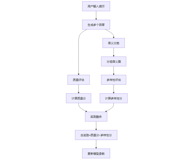 传统的做法可能是将质量奖励和多样性奖励简单相加。但这种方式存在一个明显的缺陷,模型可能会为了追求多样性得分,而生成一些质量低下但与众不同的“垃圾”回答。