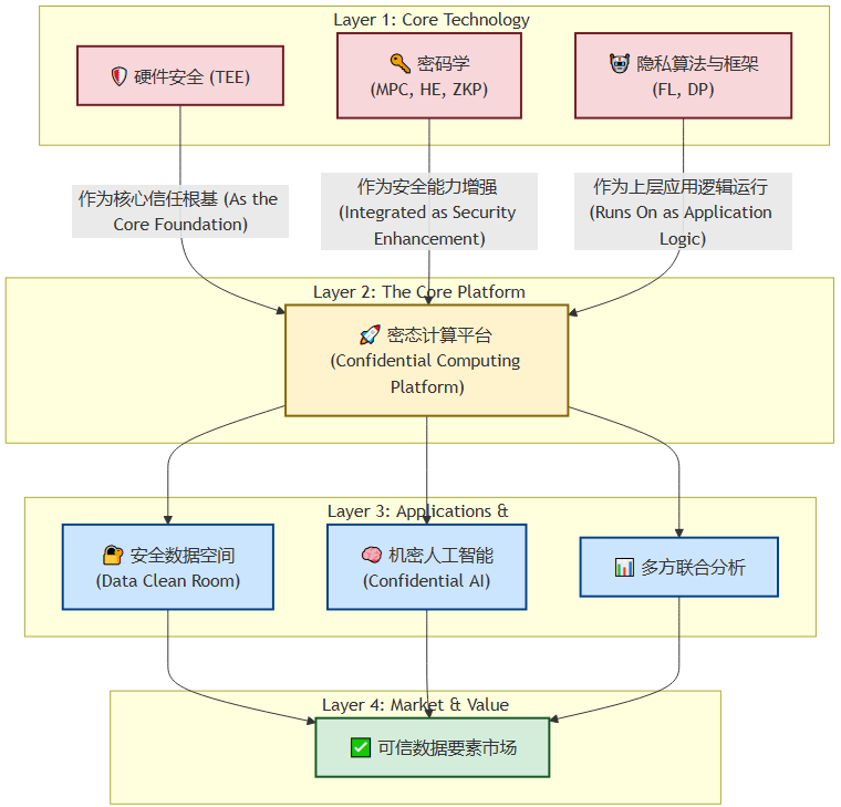 密态计算是一个系统,而非单一技术:它是一个以硬件安全(TEE)为基石,融合了密码学和上层隐私算法的综合性平台。