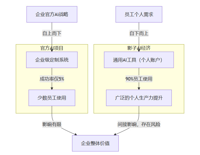 在这两种力量的拉扯之间,一个有趣的现象浮出水面——“影子AI经济”(Shadow AI Economy)。报告揭示,虽然只有40%的企业为员工统一购买了官方的大模型订阅服务,但实际上,高达90%的员工在日常工作中,或多或少地在使用个人账户的AI工具来辅助工作。