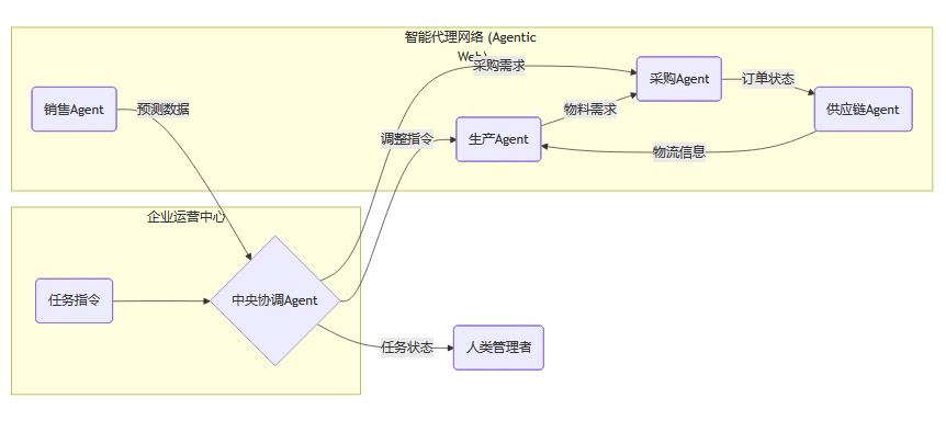 未来的企业运营不再依赖于人类员工去操作一个个孤立的软件系统。取而代之的,是一个由财务Agent、采购Agent、营销Agent等组成的网络。当需要完成一个复杂的跨部门任务时,这些Agent能够自主地进行沟通、协商和协作,共同完成目标。