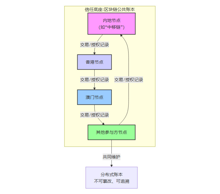分布式特性:传统的数据库由单一机构控制,存在单点故障和被篡改的风险。而区块链网络由多个参与方(如内地的运营商、香港的机构)共同维护一个统一的账本。任何一笔记录(如一次数据授权),都必须经过多数节点的共识才能写入,并同步到所有节点的账本上。
