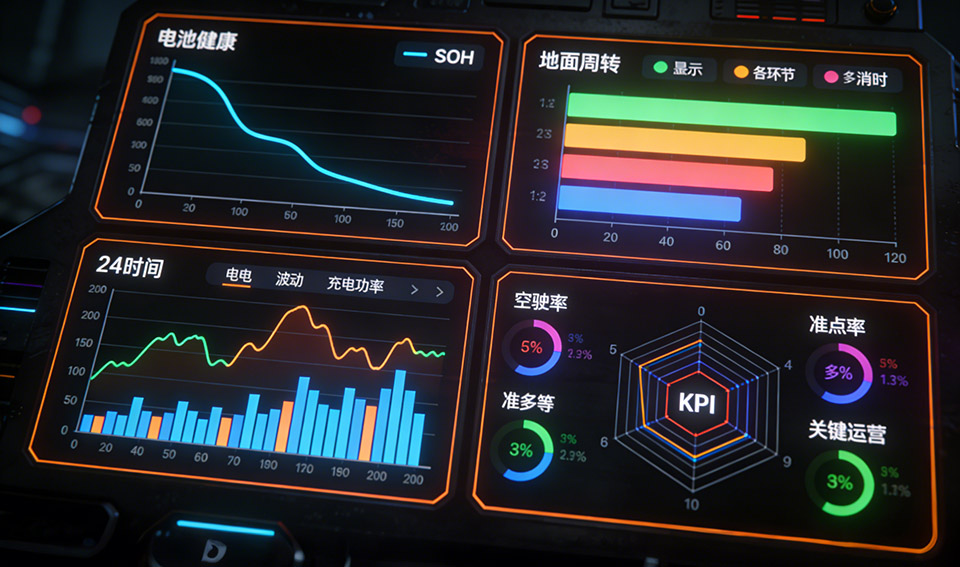 分析。这条曲线可以直观地暴露周转流程中的瓶颈环节。例如,如果发现充电时长占比过高且波动大,就需要检查充电桩的性能或充电策略;如果上下客时间不稳定,则可能需要优化登机流程或乘客引导。