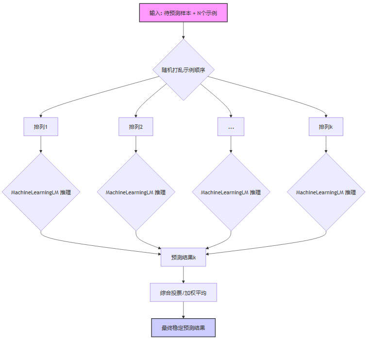 LLM的预测结果有时会对输入示例的顺序非常敏感。为了克服这个不稳定性,MachineLearningLM引入了一种类似“专家会诊”的机制。在进行预测时,它会: